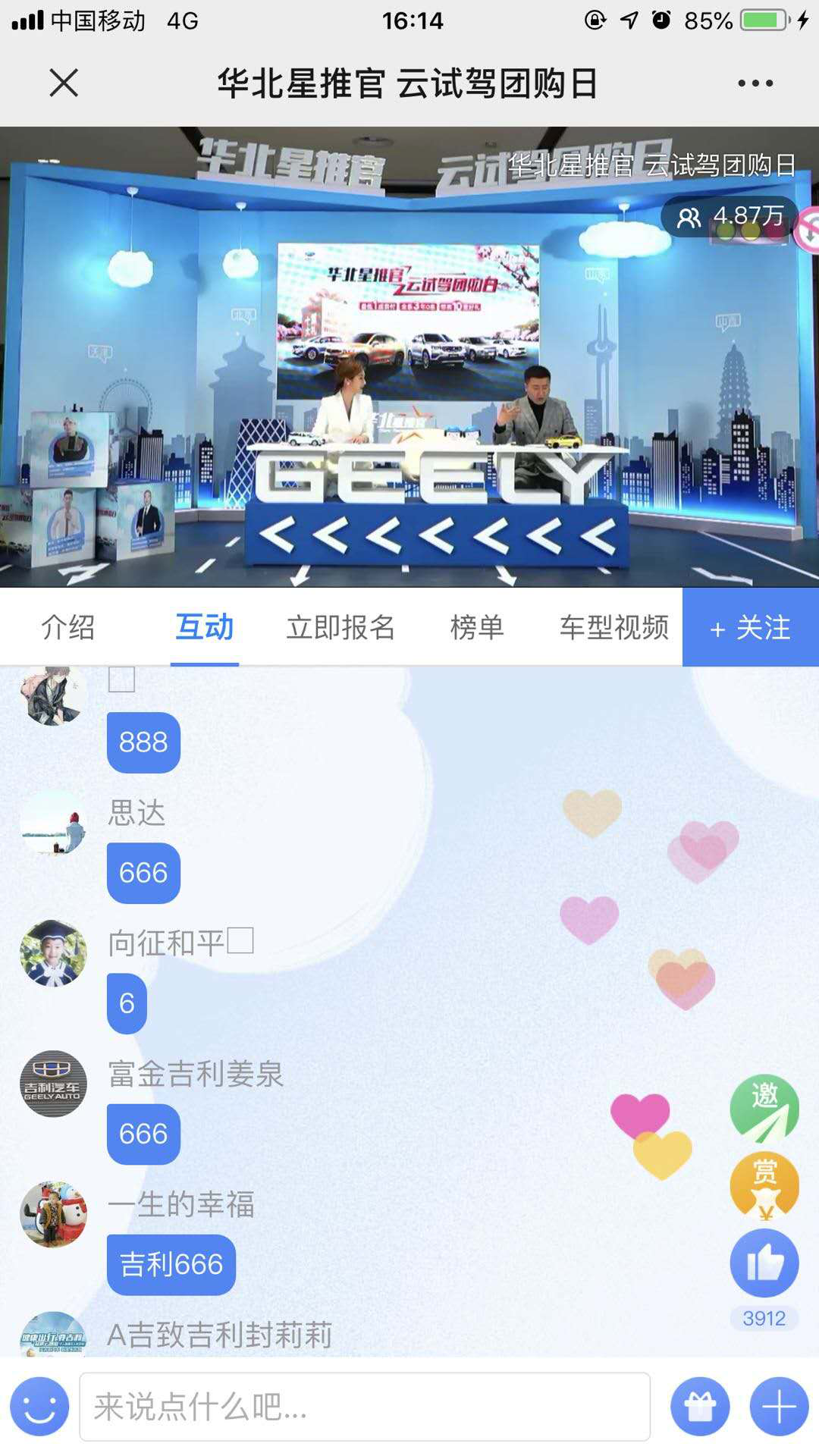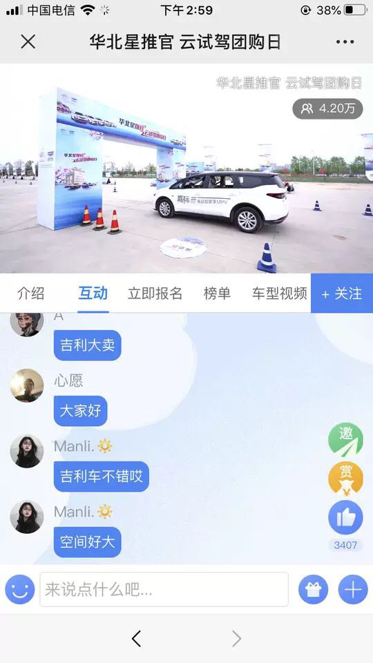 2020年4月12日,華北星推官,云試駕團(tuán)購日——吉利汽車華北區(qū)域聯(lián)動直播試駕團(tuán)購活動,在線上線下聯(lián)動開展,線下實(shí)地開展試駕,線上同步進(jìn)行直播,開啟試駕團(tuán)購新方式。
