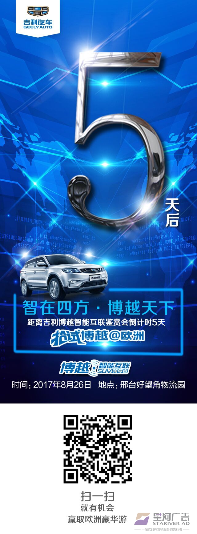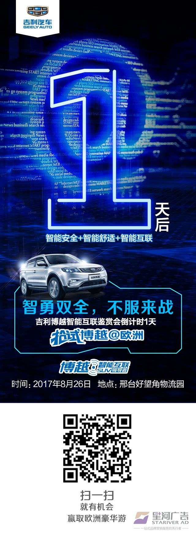 博越是吉利汽車進入“3.0”代后推出的首款智能互聯(lián)精品SUV,是吉利汽車SUV發(fā)展戰(zhàn)略的開山之作,特別是在智能安全、智能駕馭、智能舒適和智能互聯(lián)方面引領(lǐng)同級車型,樹立了中國SUV市場新標(biāo)桿。憑借精準(zhǔn)的市場定位,去年3月份一經(jīng)推出,博越就成為市場上備受追捧的網(wǎng)紅車型。 全國性巡回活動——搶試博越@歐洲—吉利博越智能互聯(lián)鑒賞會,如何結(jié)合區(qū)域問題,促進營銷活動對銷售的轉(zhuǎn)化成為我司面臨的主要問題。