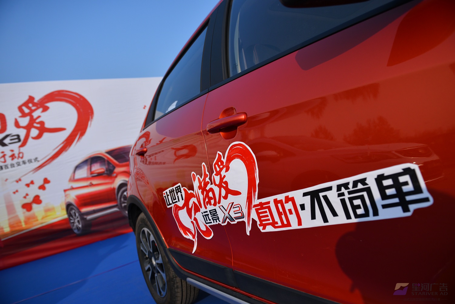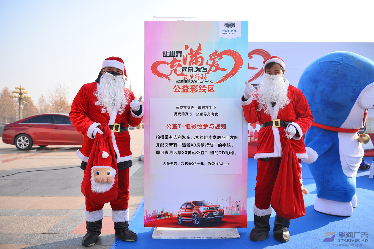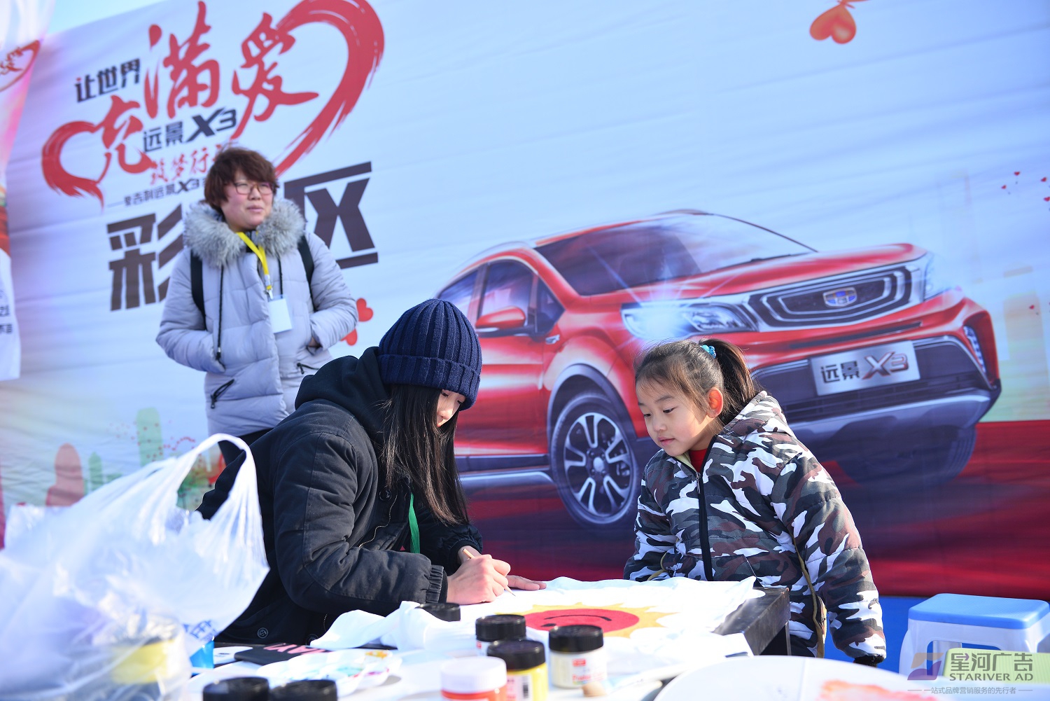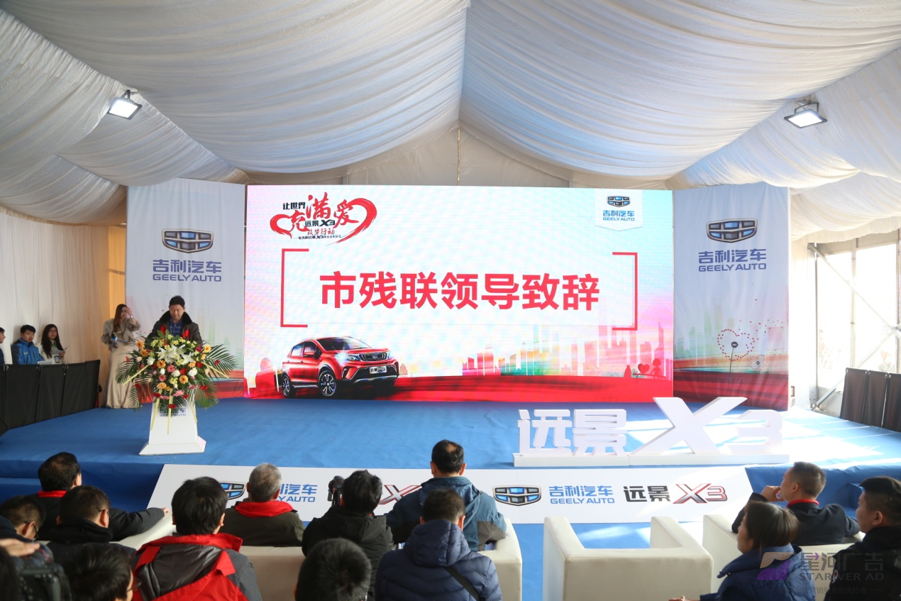 活動背景:2017年吉利遠景x3上市,新款SUV高顏值,強安全,超便利,真舒適以及超劃算迎來了上市。如何讓客戶更加詳細的了解吉利新款遠景x3和強勢曝光吉利品牌,成了我們現(xiàn)在主要面對的問題。星河廣告緊密結(jié)合世界助殘日這一活動熱點,策劃了“讓世界充滿愛,遠景x3助殘活動”這一大型主題交車活動。