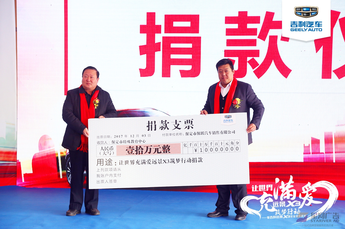 引出此次吉利汽車公益之措,并按當(dāng)天交車每臺車500元用于當(dāng)?shù)貧埪?lián)的捐助,現(xiàn)場為教育局中心領(lǐng)導(dǎo)捐贈用于購買教具的支票。而后,市殘聯(lián)、教育局及吉利大區(qū)領(lǐng)導(dǎo)三方共同填滿鎏金沙啟動臺,寓意啟動遠景x3公益事業(yè)。而后市殘聯(lián)為吉利汽車保定寶躍4s店授予“保定公益愛心汽車企業(yè)”獎牌。