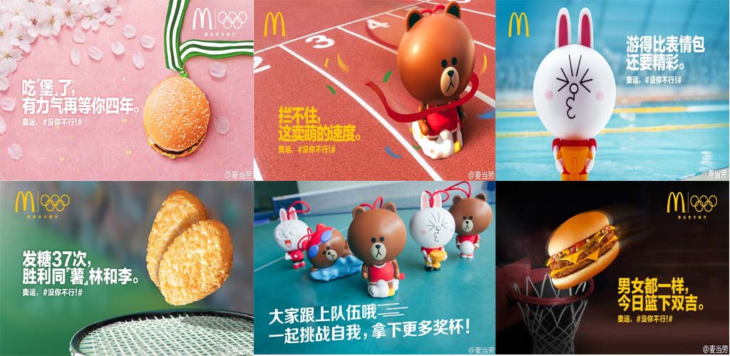 麥當(dāng)勞:奧運,#沒你不行# 麥當(dāng)勞這次不僅做了奧運會的贊助,同時和LINE跨界合作,話題之中,更是在煽動大家不僅為奧運一起歡聚,也來一起為布朗熊、可妮兔歡聚。