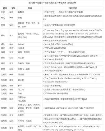 2023年11月18日,第30屆中國(guó)國(guó)際廣告節(jié)長(zhǎng)城獎(jiǎng)?lì)C獎(jiǎng)典禮在廈門舉辦,長(zhǎng)城獎(jiǎng)(廣告學(xué)術(shù)類)等級(jí)獎(jiǎng)名單現(xiàn)場(chǎng)揭曉,并為獲獎(jiǎng)?wù)哳C發(fā)了獎(jiǎng)杯。本屆長(zhǎng)城獎(jiǎng)(廣告學(xué)術(shù)類)自今年6月開(kāi)始征集以來(lái),共收到報(bào)送作品114件,其中著作27本,論文87篇。2023年11月由中國(guó)廣告協(xié)會(huì)學(xué)術(shù)與教育工作委員會(huì)組織的評(píng)選小組秉持規(guī)范、客觀與公正的原則,經(jīng)過(guò)嚴(yán)格的篩選和評(píng)審,最終評(píng)選出27件獲獎(jiǎng)作品,其中等級(jí)作品10件(包括金獎(jiǎng)1件、銀獎(jiǎng)3件、銅獎(jiǎng)6件),優(yōu)秀作品17件。
