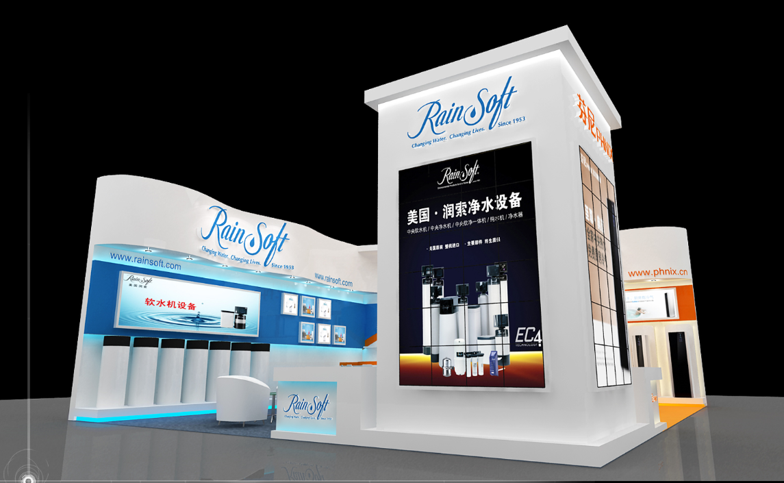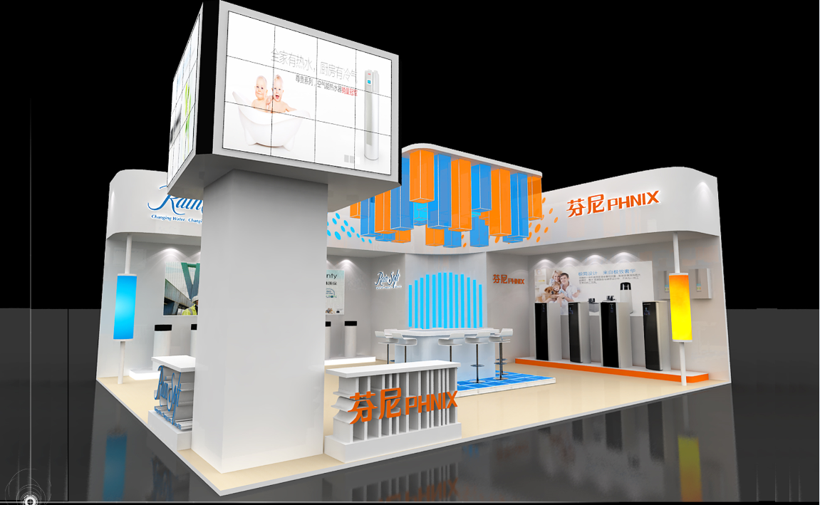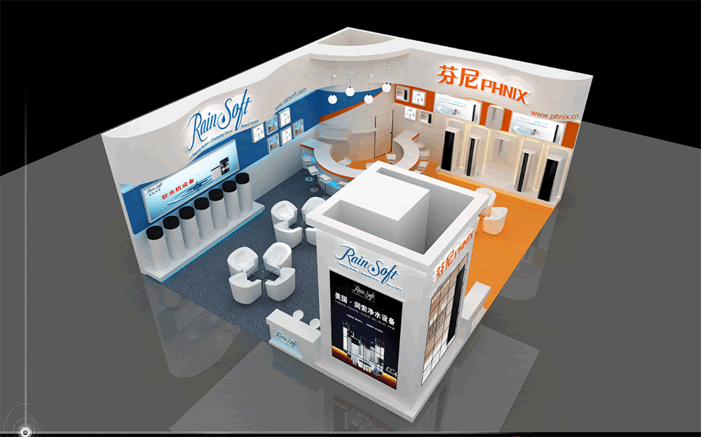設(shè)計(jì)理念:潤(rùn)鎖和芬妮是都是家庭用水的好幫手,雖然倆個(gè)的屬性是不一樣的,但是兩個(gè)牌子這是相輔相成在同一個(gè)展位里,所以既要把兩個(gè)牌子的區(qū)別做出又要在兩個(gè)牌子的區(qū)別里找出統(tǒng)一,把展位統(tǒng)一化,首先我有兩個(gè)牌子的logo座位兩個(gè)在同一個(gè)展位展臺(tái)的主色調(diào),再用統(tǒng)一的流線(xiàn)型和展示方式把它倆的產(chǎn)品展示出來(lái),這樣就會(huì)有統(tǒng)一性。
