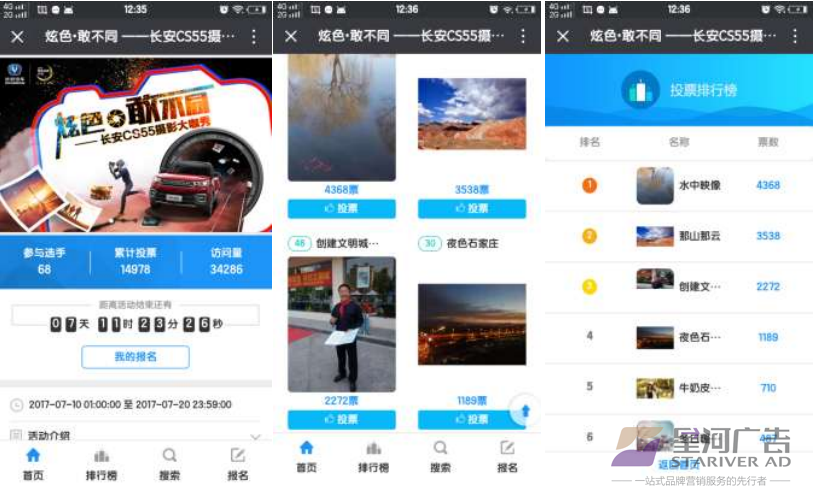 (3)后期-“長安CS55超級試駕員”英雄帖微信投票評選活動。為延長CS55搖滾轟趴夜的傳播生命線,使產(chǎn)品在活動后的市場熱度持續(xù)發(fā)酵,現(xiàn)場活動幾近尾聲時,對廣招英雄帖微信投票活動進行了預(yù)告。