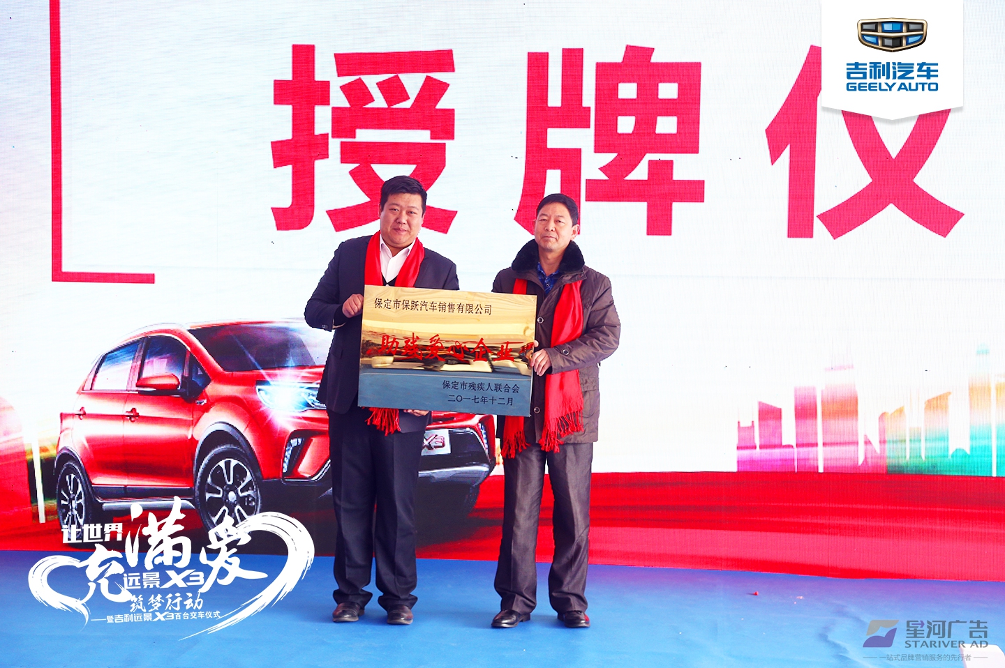 活動背景:2017年吉利遠景x3上市,新款SUV高顏值,強安全,超便利,真舒適以及超劃算迎來了上市。如何讓客戶更加詳細的了解吉利新款遠景x3和強勢曝光吉利品牌,成了我們現(xiàn)在主要面對的問題。星河廣告緊密結(jié)合世界助殘日這一活動熱點,策劃了“讓世界充滿愛,遠景x3助殘活動”這一大型主題交車活動。